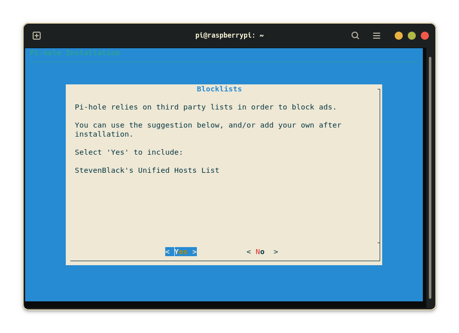 which downloads Pi-hole from the GitHub repository and starts the installation wizard. First, a warning will pop up that a static IP address must be configured, just press continue. Next, select an upstream DNS provider from the list. Pi-hole prompts the user to choose a blocklist. I chose StevenBlack’s default list which works great and eliminates most ads.